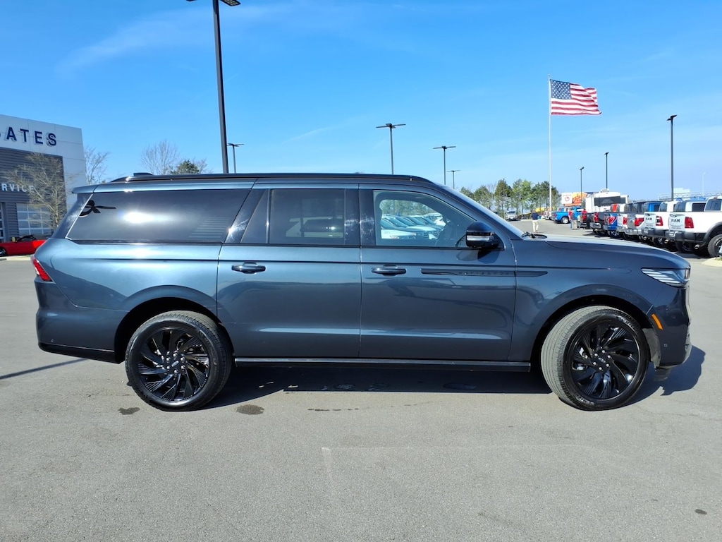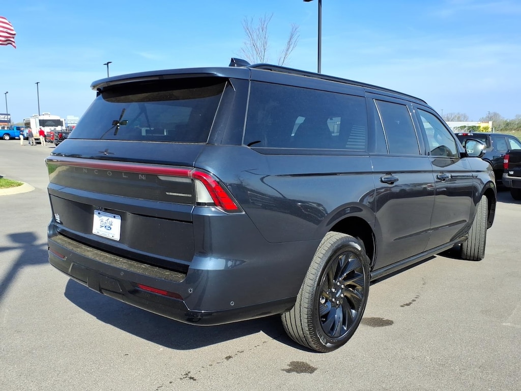 Blue Metallic 2025 Lincoln Navigator L Reserve 4WD 10-Speed Automatic 3.5L V6 **ONE OWNER**, 26mm Engine Radiator, 28 Speakers, 2nd Row Heated & Ventilated Dual Captain's Chair, 3rd row seats: split-bench, 4-Wheel Disc Brakes, ABS brakes, Adaptive suspension, Adjustable pedals, Air Conditioning, All-Weather Flr Liners w/o Fr & Rr Carpet Flr Mats, Alloy wheels, AM/FM radio: SiriusXM with 360L, Apple CarPlay/Android Auto, Audio memory, Auto High-beam Headlights, Auto Htd & Ventilated Premium Lthr Captain's Chair, Auto Start-Stop Technology, Auto tilt-away steering wheel, Auto-dimming door mirrors, Auto-dimming Rear-View mirror, Auto-leveling suspension, Automatic temperature control, Black Accent Badge, Black Accent Interior Pack, Black Beltline Molding, Black Painted Roof Rails, Brake assist, Bumpers: body-color, Compass, Delay-off headlights, Driver door bin, Driver vanity mirror, Driver's Seat Mounted Armrest, Dual front impact airbags, Dual front side impact airbags, Electronic Stability Control, Equipment Group 202A Reserve II, Exterior Parking Camera Rear, Four wheel independent suspension, Front anti-roll bar, Front Bucket Seats, Front Bumper Fascia, Front dual zone A/C, Front reading lights, Fully automatic headlights, Garage door transmitter, Heated door mirrors, Heated front seats, Heated rear seats, Heated steering wheel, Heavy-Duty Trailer Tow Package, HVAC memory, Illuminated entry, Jet Appearance Package, Leather steering wheel, Lincoln Connect, Lincoln Lit Star, Lincoln Premium Connectivity, Low tire pressure warning, Memory seat, Occupant sensing airbag, Outside temperature display, Overhead airbag, Overhead console, Passenger door bin, Passenger seat mounted armrest, Passenger vanity mirror, Pedal memory, Power adjustable front head restraints, Power adjustable rear head restraints, Power door mirrors, Power driver seat, Power moonroof, Power passenger seat, Power steering, Power windows, Radio data system, Radio: Revel Ultima 3D AM/FM/HD Audio System, Rain sensing wipers, Rear air conditioning, Rear anti-roll bar, Rear reading lights, Rear window defroster, Rear window wiper, Reclining 3rd row seat, Remote keyless entry, SiriusXM w/360L, Speed control, Speed-sensing steering, Speed-Sensitive Wipers, Split folding rear seat, Spoiler, Steering wheel memory, Steering wheel mounted audio controls, Tachometer, Telescoping steering wheel, Tilt steering wheel, Traction control, Trailer Brake Controller, Trip computer, Turn signal indicator mirrors, Unique Lincoln Grille Pillar Black Surround, Variably intermittent wipers, Ventilated front seats, Wheels: 22" High-Gloss Ebony Aluminum.